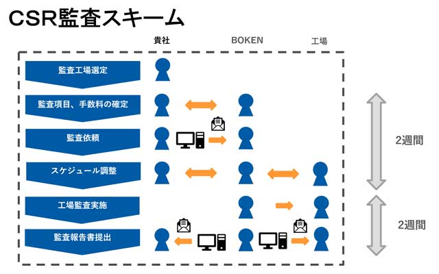 またCSR監(jiān)査では、初回監(jiān)査を?qū)g施して終わりということではなく、不適合が出た場合は、そこからの改善是正がとても重要です。実際CSR監(jiān)査を?qū)g施させていただいていると、たくさんの不適合がでるという場合が多いのが現(xiàn)狀です。BOKENでは監(jiān)査後の改善點(diǎn)をどのように実施すればよいかをサポートするフォローアップ監(jiān)査を?qū)g施しております。BOKENはCSR監(jiān)査の経験実績から、工場様の抱える問題點(diǎn)を把握し、改善ができるまで、しっかりとサポートをしていきます。詳細(xì)はお問い合わせください。
