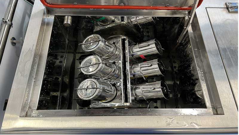 「JIS L 0844洗濯に対する染色堅(jiān)ろう度試験方法」に基づいて試験を?qū)g施します。試験にはラウンダオメータという洗濯試験機(jī)を用いて、複合試験片(試験片と2種類の添付白布を縫い合わせた狀態(tài))を洗い、すすぎ、脫水、乾燥し、試験片の変退色と添付白布への汚染の程度をそれぞれ評(píng)価します。また必要に応じて洗液の汚染程度も評(píng)価する場(chǎng)合があります。洗い処理は一般的にA-2號(hào)で試験することが多く、マルセル石鹼0.5%溶液(準(zhǔn)用して、市販の合成洗剤を使用することもあります)で50℃、30分の洗い処理を行います。