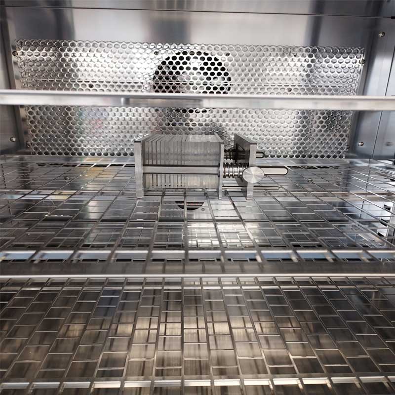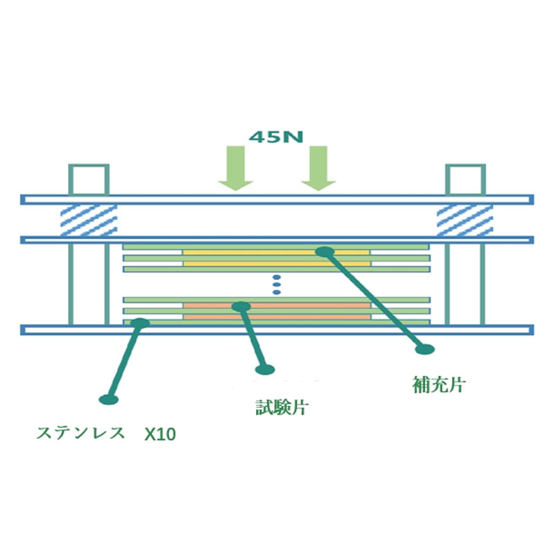 「JIS L 0854昇華に対する染色堅(jiān)ろう度試験方法」に基づいて試験を?qū)g施します。複合試験片(試験片と2種類の添付白布を縫い合わせた狀態(tài))をステンレス板に挾み、汗試験機(jī)に取付けて約12.5kPa(6cm×6cmの試験片の場(chǎng)合約45N)の荷重をかけます。汗試験機(jī)を120℃±2℃の乾燥機(jī)で 80分間処理した後、汗試験機(jī)から複合試験片を取り離し、試験片の変退色と添付白布の汚染の程度をそれぞれ判定します。