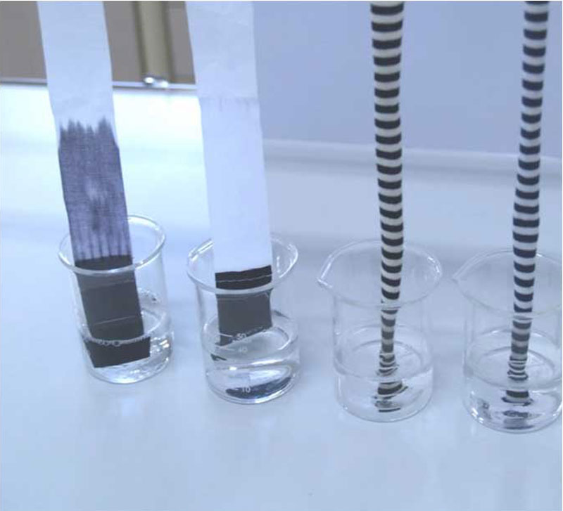 異色濃淡組合せのプリント、配色使い、先染めボーダー等の染色部分から白場(chǎng)や淡色部への染料の泣き出し(ブリード)を試験します。ボーケンでは「色泣き試験方法(大丸法)」に基づいて試験を?qū)g施しています。試料の調(diào)整は、プリント柄や縞柄生地の場(chǎng)合は細(xì)長(zhǎng)く切ったものを試験片とし、無(wú)地の場(chǎng)合は2.5cm×3cmの試料を長(zhǎng)さ約20cmの綿添付白布と縫付け、試験片とします。0.05%非イオン界面活性剤溶液の入ったビーカーに、試験片の片端を2cm浸漬します。2時(shí)間放置した後、ビーカーを取り除いて自然乾燥し、白場(chǎng)又は添付白布への汚染の程度をグレースケールにて判定します。