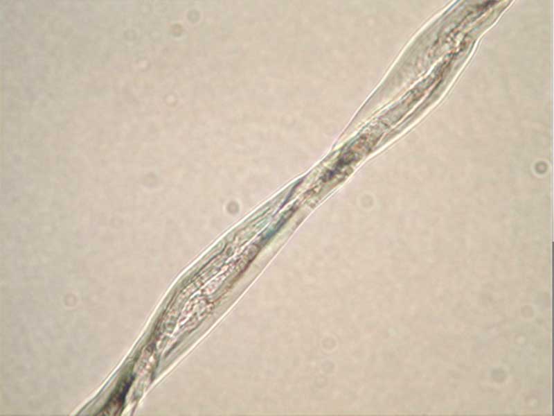 顕微鏡用いて倍率約100~500倍で繊維の側(cè)面及び斷面を観察し、繊維の標(biāo)準(zhǔn)寫真と形態(tài)記述を照合して未知繊維の種類を鑑別する。