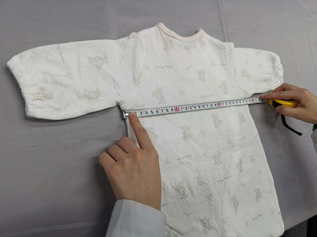 縫い糸切れ、針穴傷、縫い目とび、縫い外れ等の縫製不良の確認(rèn)をします。